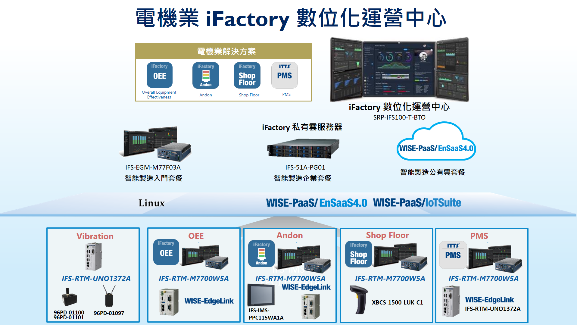 智慧製造解決方案針對機電產業,提供套裝內容包含研華WISE-IoT Suite 平台上iFactory@機電業應用解決方案,協助電機、電子、機械產業建構數位化營運中心,提供iAPP雲端應用程式包含PMS預防性維護系統、OEE整體設備效率管理系統、Andon安燈應用程式、Shop Floor生產線現場管理系統等,透過雲端系統套件快速導入,以改善生產效能,加速機電業數位轉型。